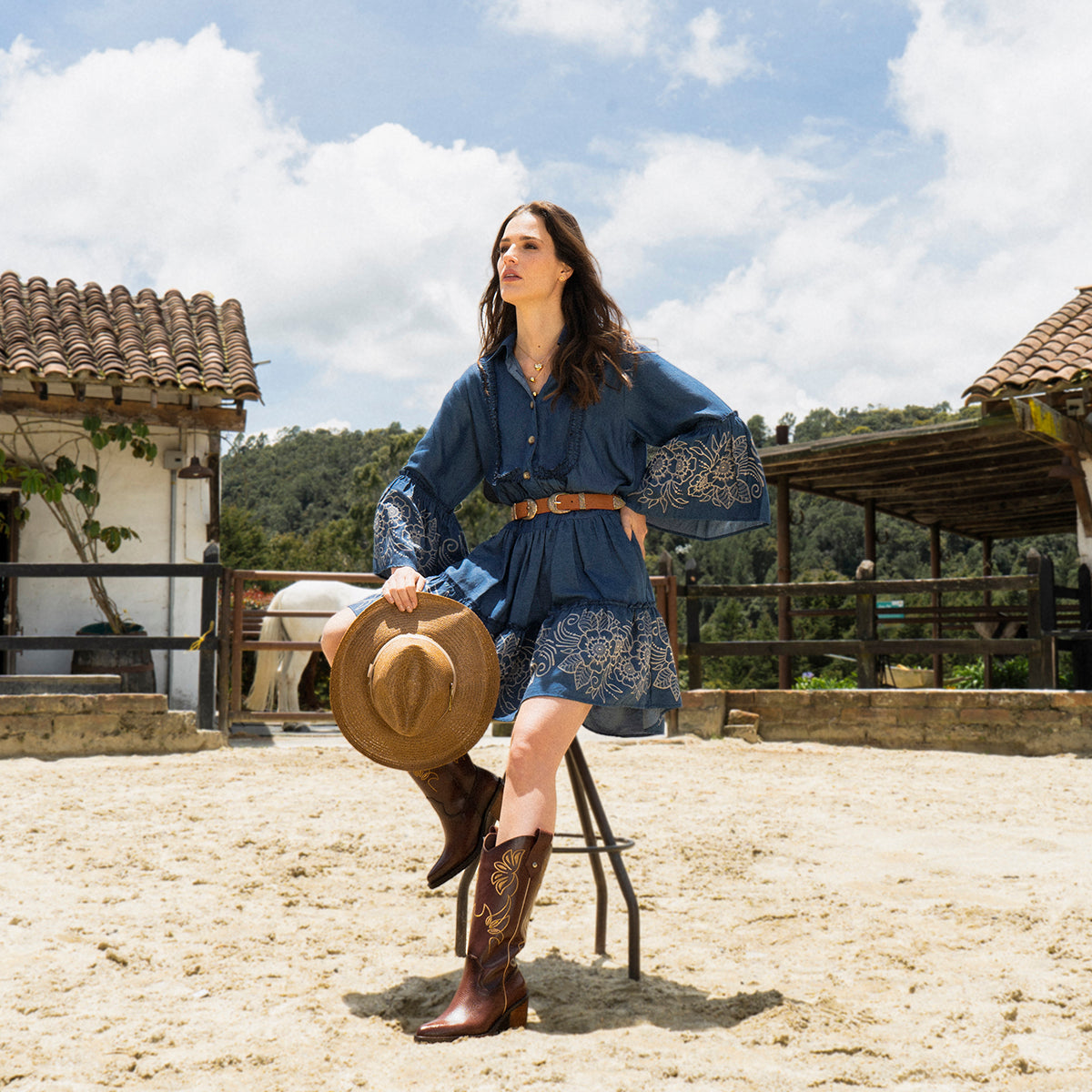 Bota texana en cuero color miel con bordado decorativo amarillo y acabado texturizado 105963