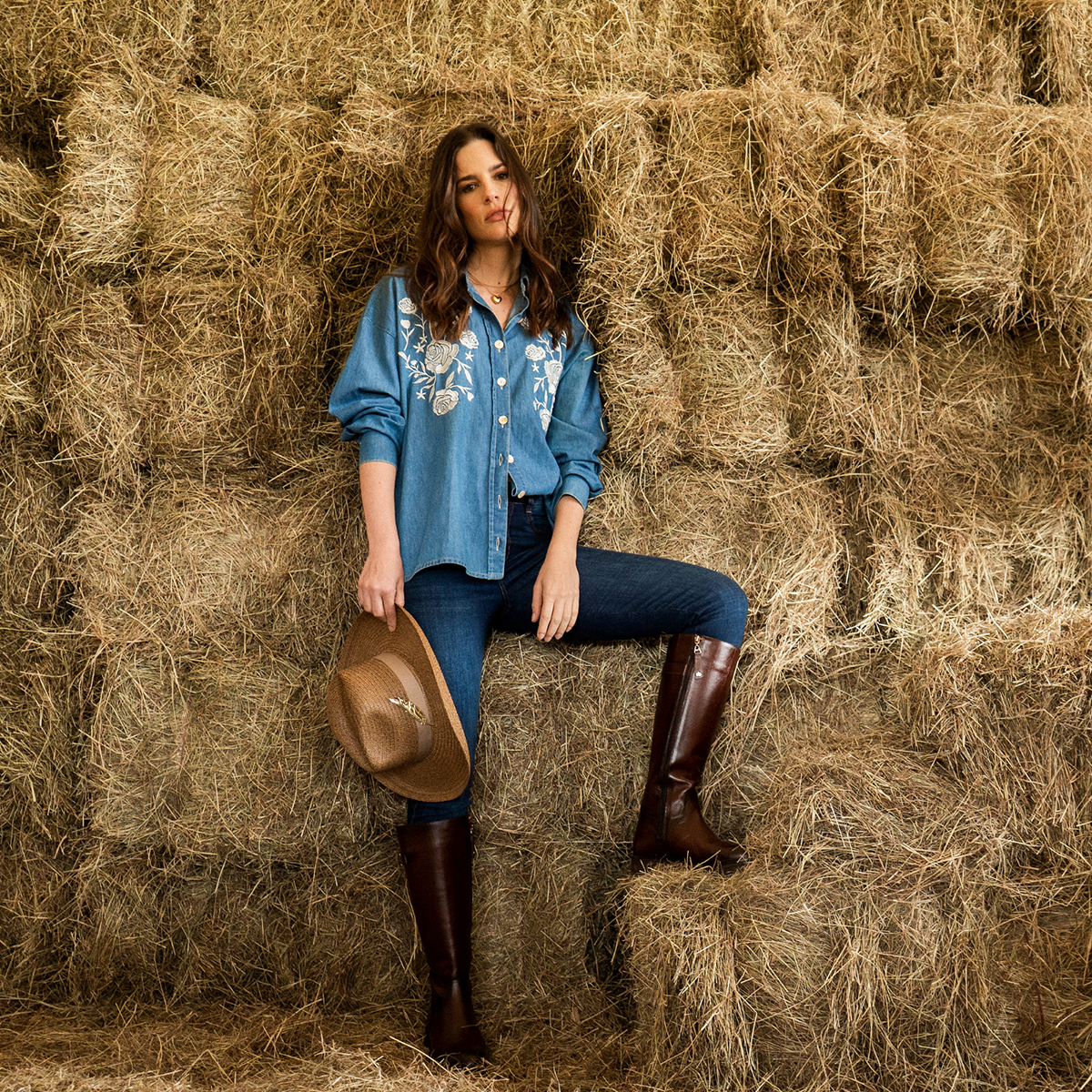 Bota texana en cuero color café con bordado de estrellas y líneas curvas 105950