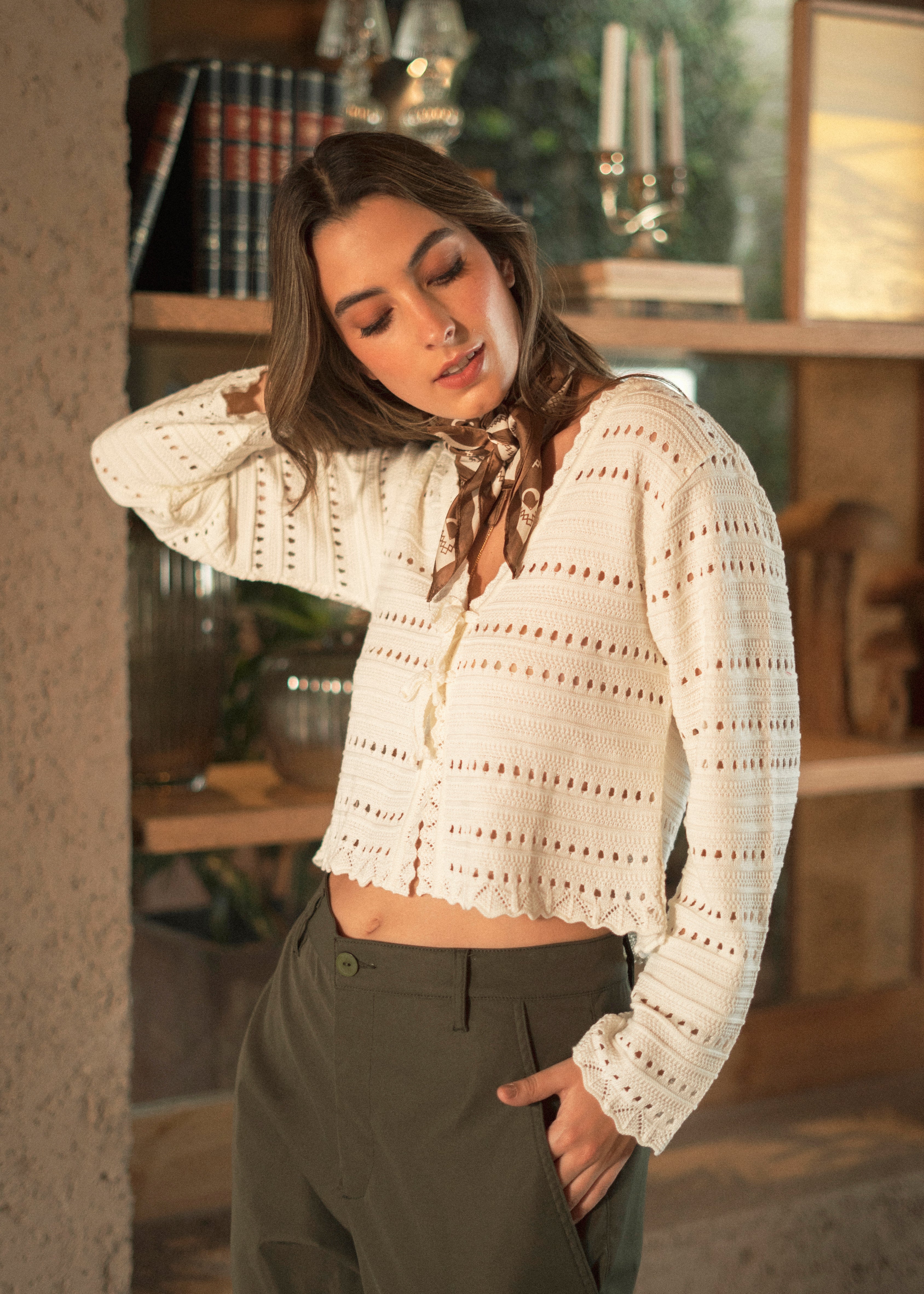 Saco en tejido color marfil con lazo frontal y detalles delicados 105742Saco en tejido color marfil con lazo frontal y detalles delicados 105742