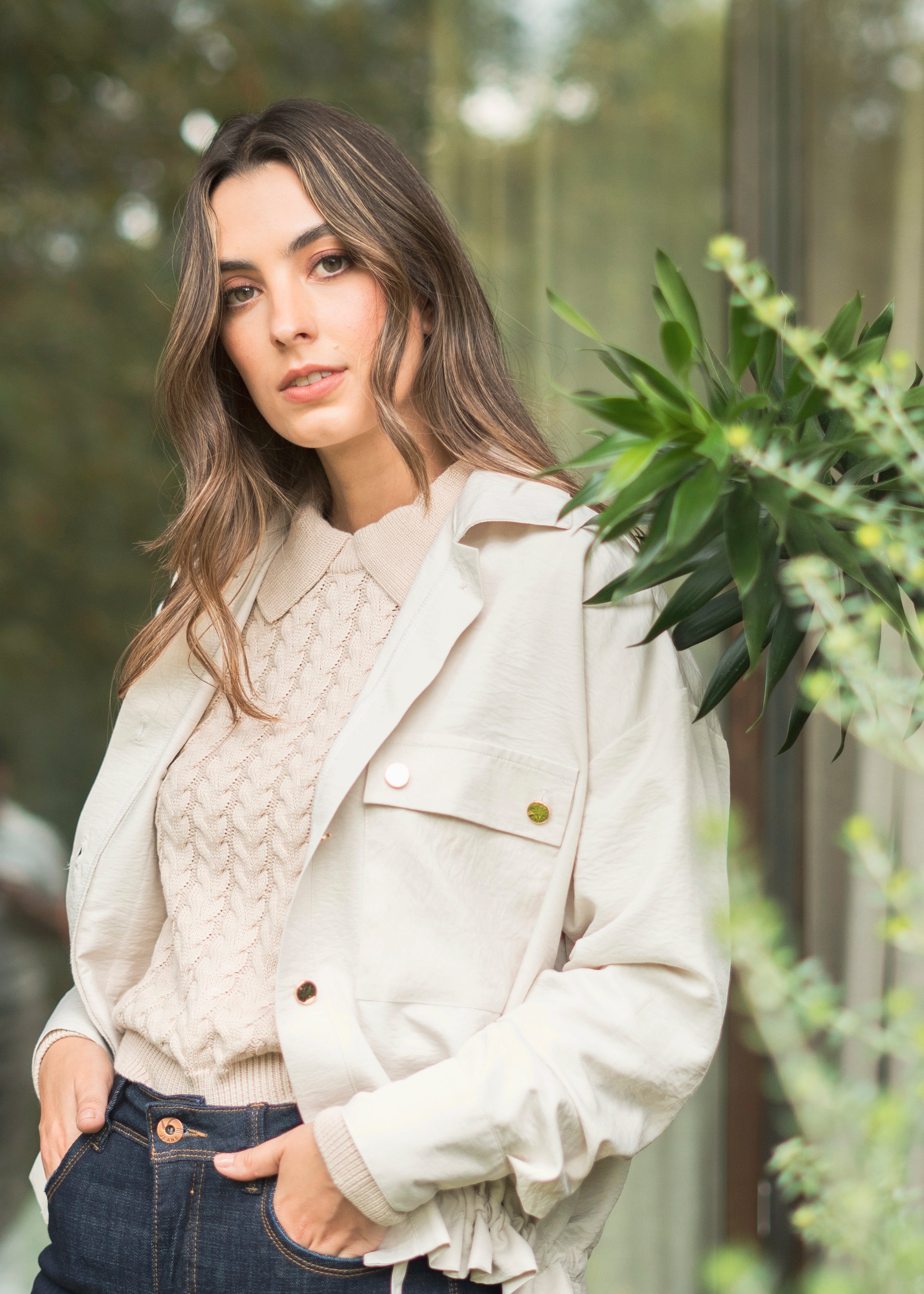Chaqueta color beige con bolsillos frontales y bordado negro 105841Chaqueta color beige con bolsillos frontales y bordado negro 105841