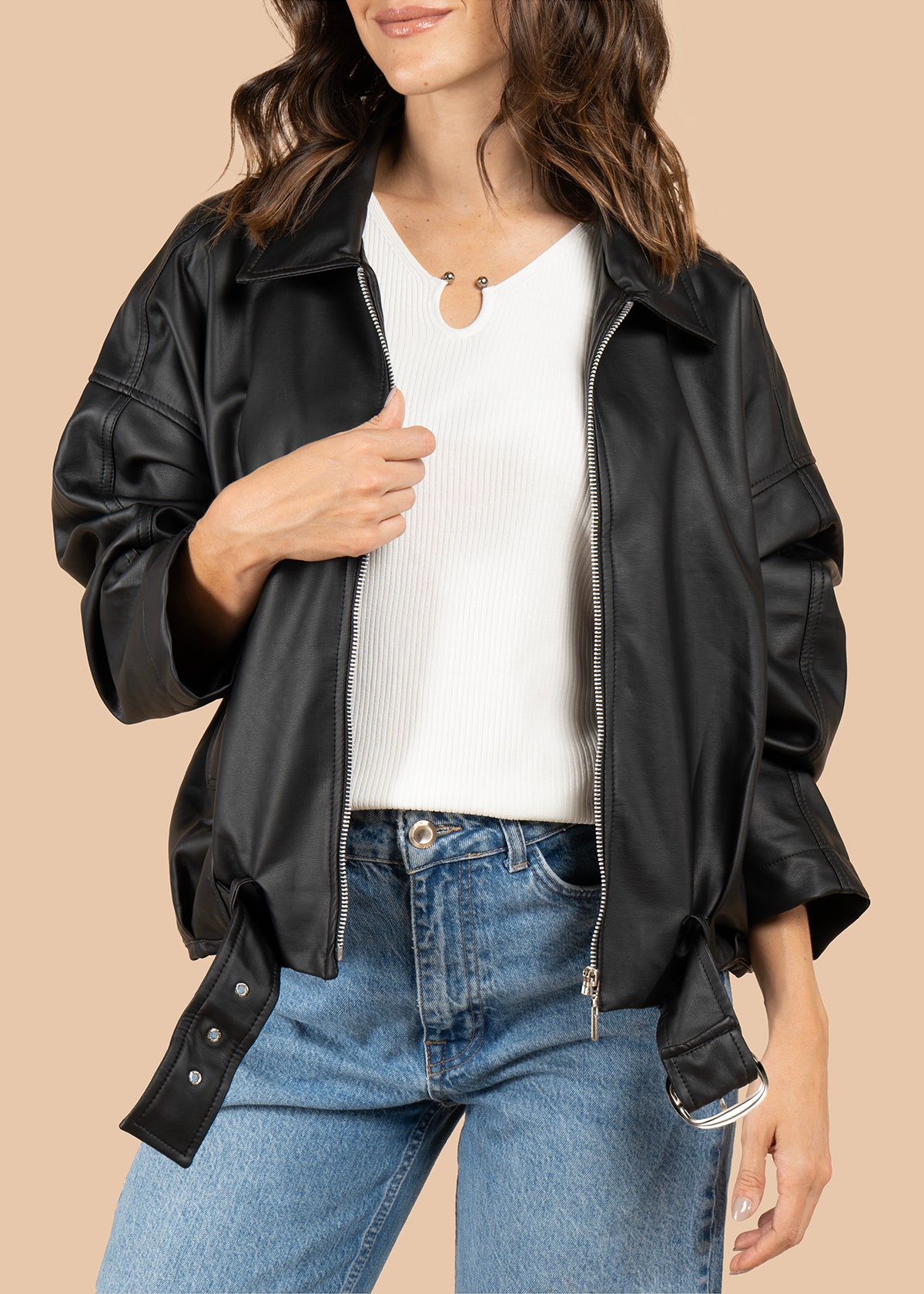 Chaqueta color negro con cremallera frontal y cinturón 106062