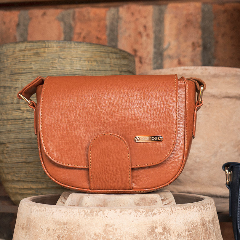 Bolso tipo cartera en cuero color miel con flecos 105787