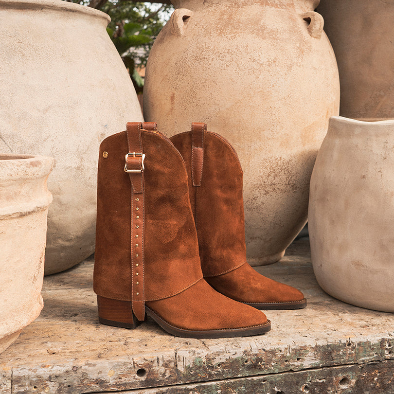 Trabilla en cuero color miel con aplique metálico dorado 106152